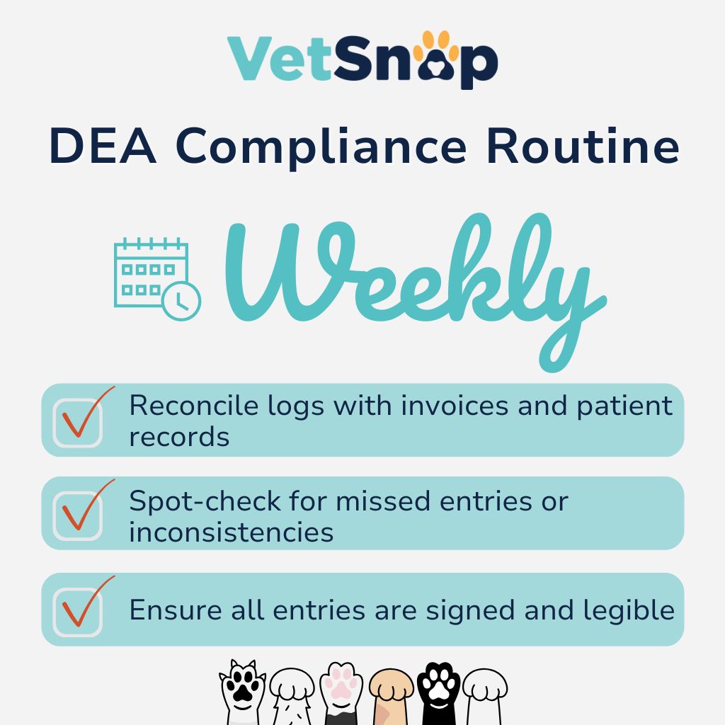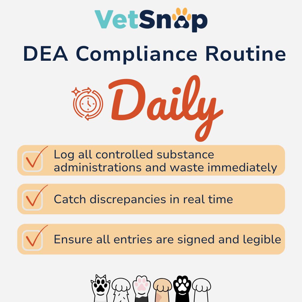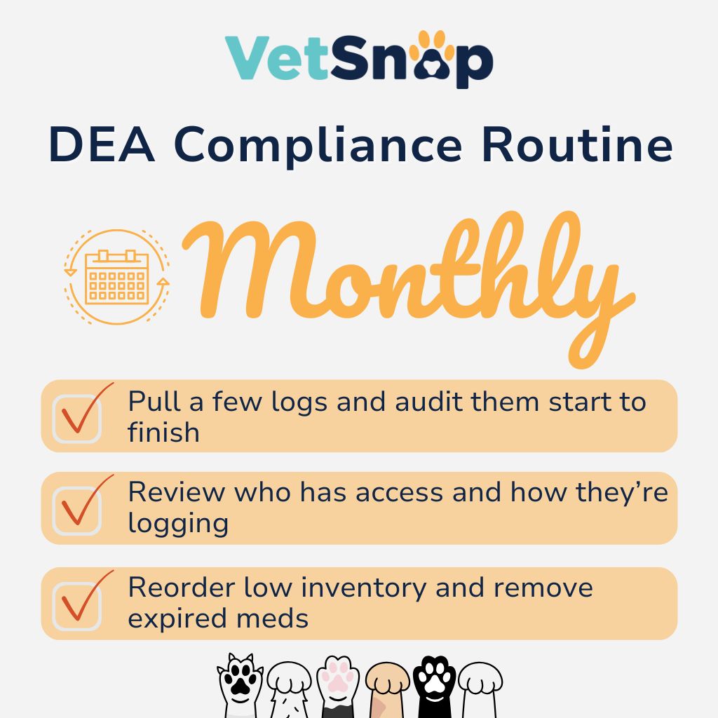 The good news? Just like we recommend wellness visits for pets, you can build a preventative care schedule for your compliance program. This way you’ll keep ahead of DEA requirements and avoid the panic of playing catch-up.